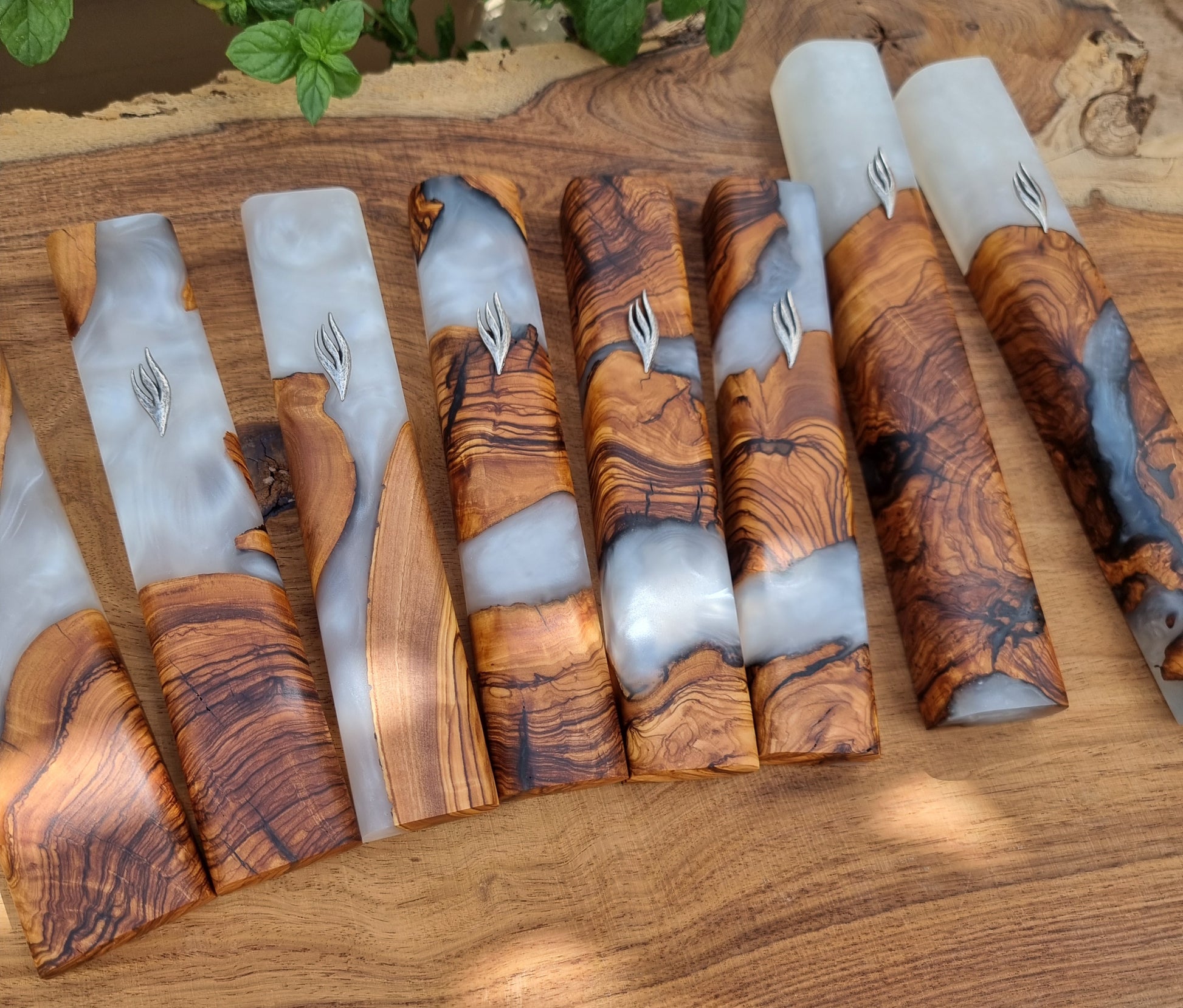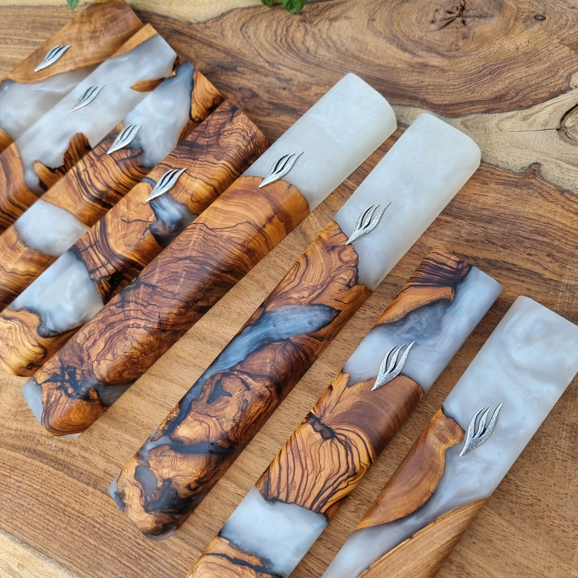 Set of magnificent for the home, 8 mezuzahs all made of Israeli olive wood with epoxy.